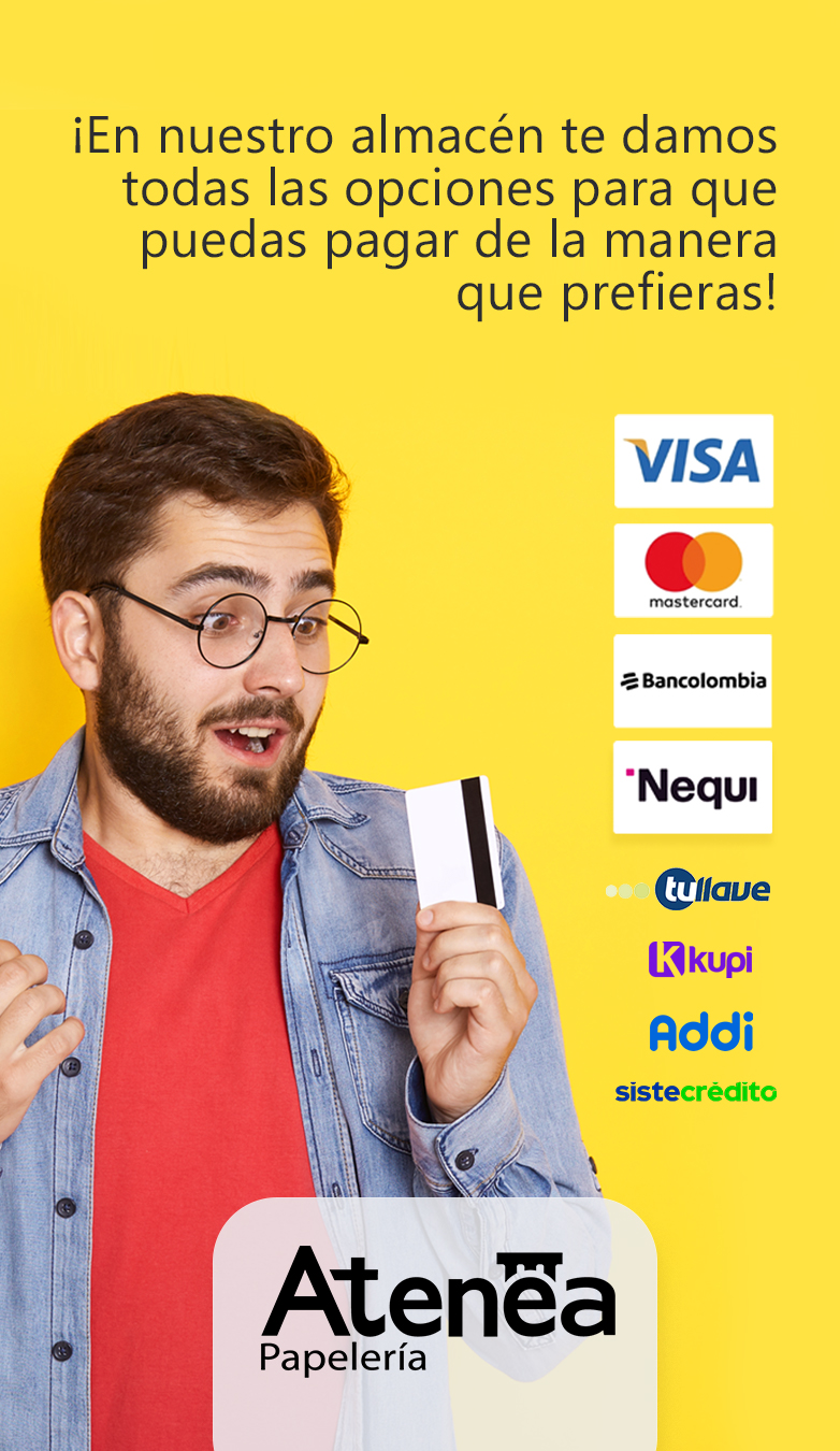 En Atenea Papelería puedes llevar todo lo que quieras a crédito. Contamos con servicios de financiación como Sistecrédito, Kupy y muy pronto Addi. Acércate a nuestro almacén y pregunta como acceder a estos beneficios.